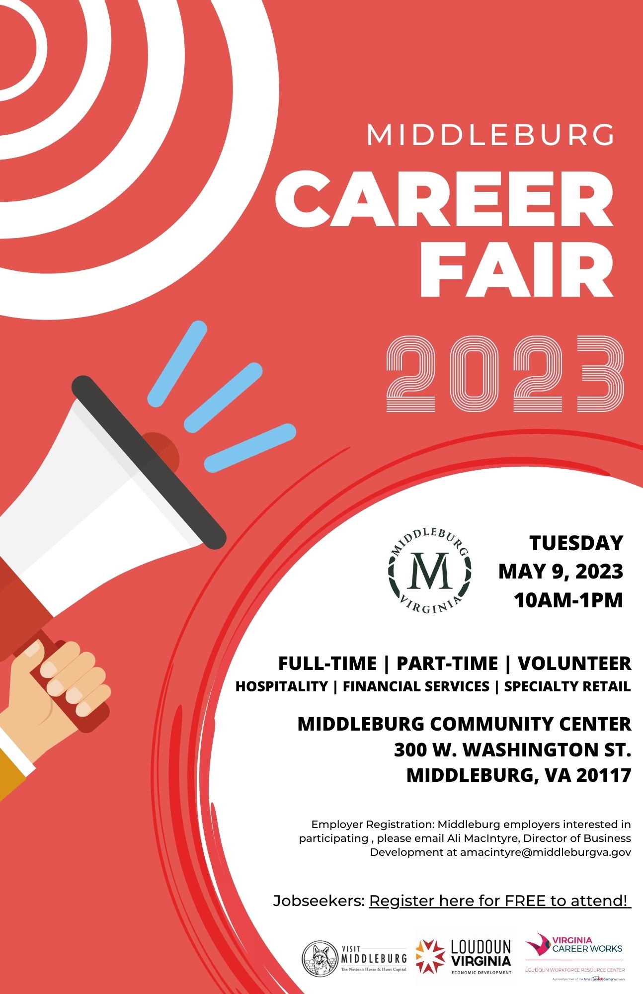 Middleburg Community Center 300 W Washington St, Middleburg, VAOn Tuesday, May 9 from 10 a.m. to 1 p.m., the Town will host a career fair at the Middleburg Community Center (300 W. Washington St., Middleburg 20117). Job openings are full time, part time, and include a few volunteer opportunities....